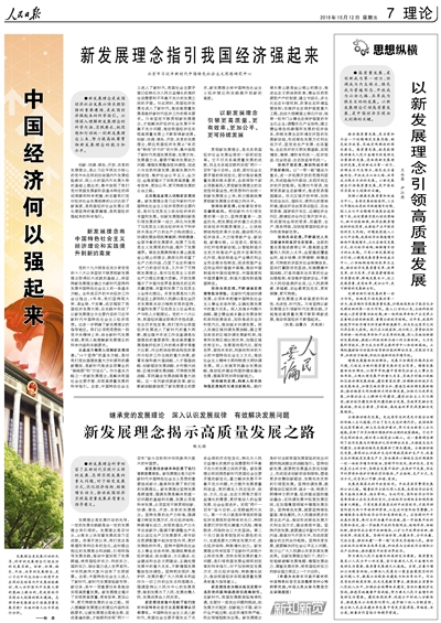 发展理念是发展行动的先导,科学的发展理念引领成功的发展实践。创新、协调、绿色、开放、共享的发展理念,是以习近平同志为核心的党中央在深刻总结国内外发展经验教训、深入分析国内外发展大势的基础上提出的,是我国经济实现由大到强的根本遵循。怎样用新发展理念引领高质量发展实践?本版约请几位专家进行分析。 ——编 者 发展理念指引我国经济强起来(人民要论) 北京市习近平新时代中国特色社会主义思想研究中心 ●新发展理念是我国经济社会发展必须长期坚持的重要遵循,是我国经济强起来的科学指引。必须深入理解新发展理念的科学内涵、实践要求,把思想和行动统一到新发展理念上来,努力提高统筹贯彻新发展理念的能力和水平。 创新、协调、绿色、开放、共享的发展理念,是以习近平同志为核心的党中央在深刻总结国内外发展经验教训、深入分析国内外发展大势的基础上提出的,集中体现了我们党对我国发展新阶段基本特征的深刻洞察和科学把握,标志着我们党对经济社会发展规律的认识达到了新高度,是我国经济社会发展必须长期坚持的重要遵循,是我国经济强起来的科学指引。 新发展理念将中国特色社会主义经济理论和实践提升到新的高度 党的十九大报告在充分肯定党的十八大以来坚定不移贯彻新发展理念取得巨大成就的基础上,将坚持新发展理念确立为新时代坚持和发展中国特色社会主义的一条基本方略。去年底召开的中央经济工作会议指出,5年来,我们坚持观大势、谋全局、干实事,成功驾驭了我国经济发展大局,在实践中形成了以新发展理念为主要内容的习近平新时代中国特色社会主义经济思想。这进一步明确了新发展理念的指导地位。我们必须把思想统一到党中央精神上来,结合新时代发展实践,更深入地理解新发展理念的科学内涵和实践要求。 从基本方略深入理解新发展理念。“14个坚持”的基本方略,是对我们党治国理政重大方针原则的最新概括,是新时代推进各项事业的“路线图”和“方法论”。作为基本方略之一的新发展理念,是解决我国社会主要矛盾、实现高质量发展的科学指引。当前,中国特色社会主义进入了新时代,我国社会主要矛盾已经转化为人民日益增长的美好生活需要和不平衡不充分的发展之间的矛盾。与此同时,我国经济发展也进入了新时代,推动高质量发展是做好新时代经济工作的根本要求。只有坚定不移贯彻新发展理念,才能解决好经济社会发展不平衡不充分问题,推动我国经济在实现高质量发展上不断取得新进展。创新、协调、绿色、开放、共享的发展理念,顺应我国经济发展从“有没有”转向“好不好”的大势,集中体现了新时代我国发展思路、发展方向、发展着力点,着眼于解决发展动力问题、增强发展整体性协调性、促进人与自然和谐发展、提高发展内外联动性、维护社会公平正义,全方位、全维度揭示了实现更高质量、更有效率、更加公平、更可持续发展的必由之路。 从思想高度深入理解新发展理念。新发展理念是习近平新时代中国特色社会主义经济思想的主要内容,是对马克思主义政治经济学的丰富和发展。创新发展强调创新是引领发展的第一动力,深化与发展了马克思主义政治经济学关于科学技术是生产力的生产力构成理论。协调发展体现统筹兼顾、持续健康、全面平衡的发展要求,拓展了马克思主义发展观的内涵,提升了发展境界。绿色发展秉持绿水青山就是金山银山的理念,既深化和丰富了生产力的内涵,凸显了生态环境与生产力的密切关系,又升华了可持续发展理念,是对马克思主义自 |