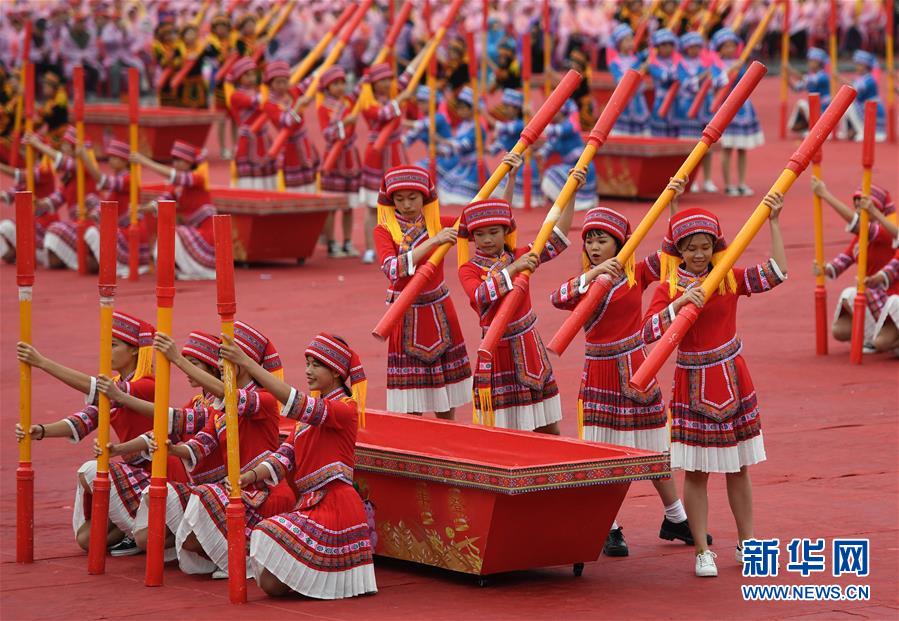 在位于南宁的广西民族村,演员在“三月三”庆祝活动上表演节目(2018年4月18日摄)。新华社南宁11月29日电 题:和睦相处一家亲 携手并进谋发展——广西民族团结发展观察 ” 在广西罗城仫佬族自治县,当地群众在仫佬族传统节日依饭节上表演节目(2017年11月7日摄)。