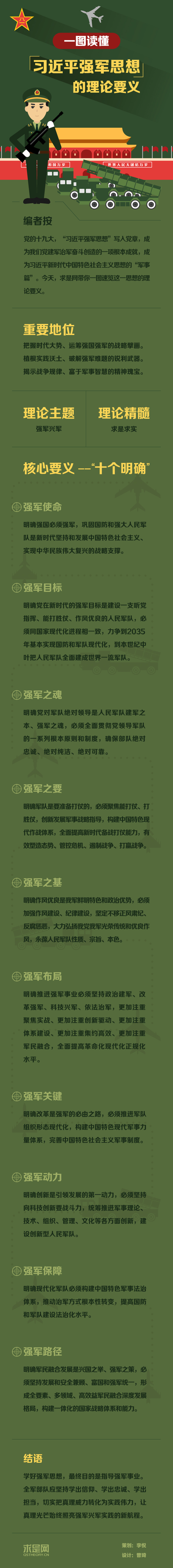 党的强军思想指引强军事业。党的十九大,“习近平强军思想”写入党章,成为我们党建军治军奋斗创造的一项根本成就,成为习近平新时代中国特色社会主义思想的“军事篇”。今天,求是网带你一图读懂这一思想的理论要义。