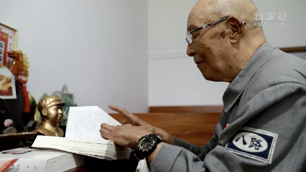 (余新元在学习党的方针政策) 如今,由于年龄原因不能外出做报告,余新元依然没有停止自己践行信念的步伐。98岁高龄的余新元坚持每天学习党的方针政策,坚持弘扬雷锋精神,在家里为党员群众讲党史、授党课。