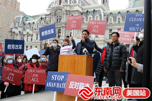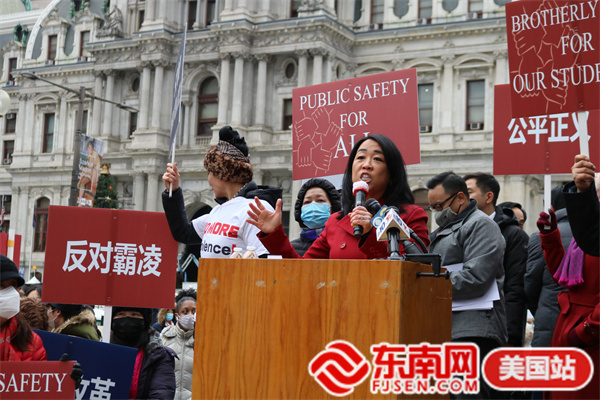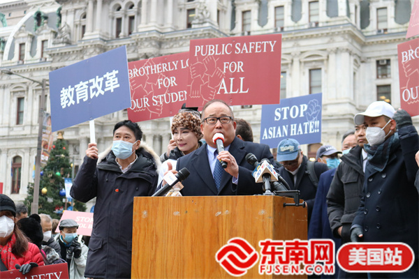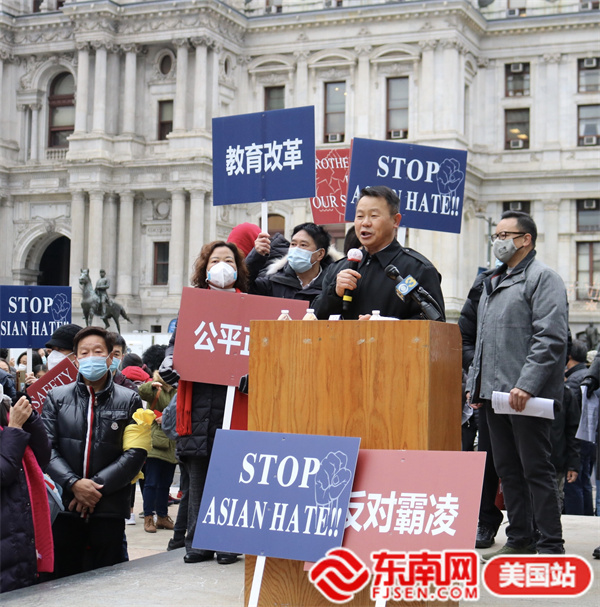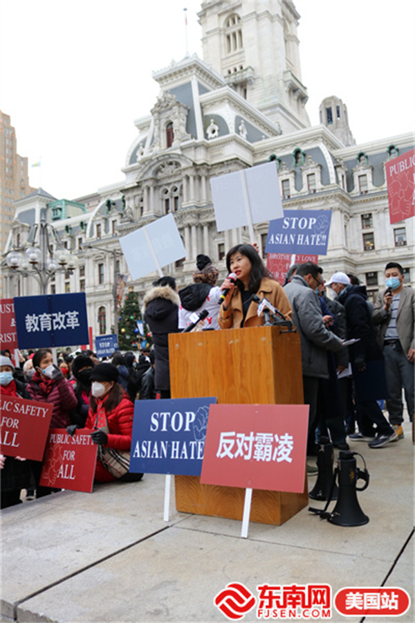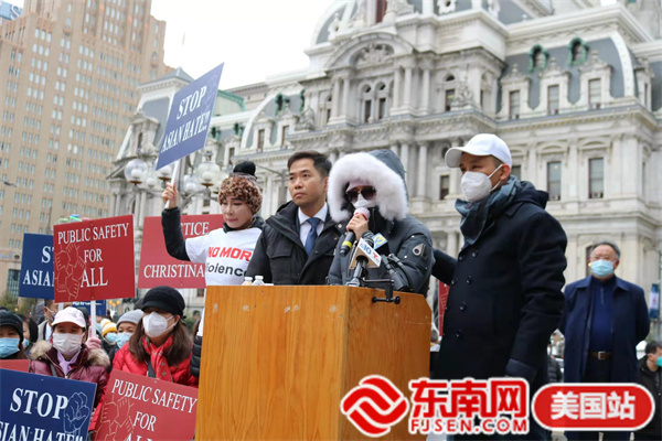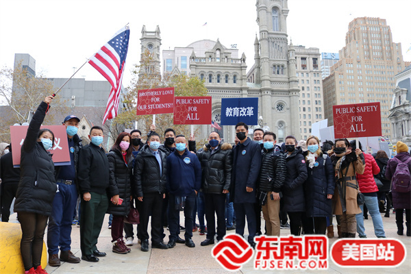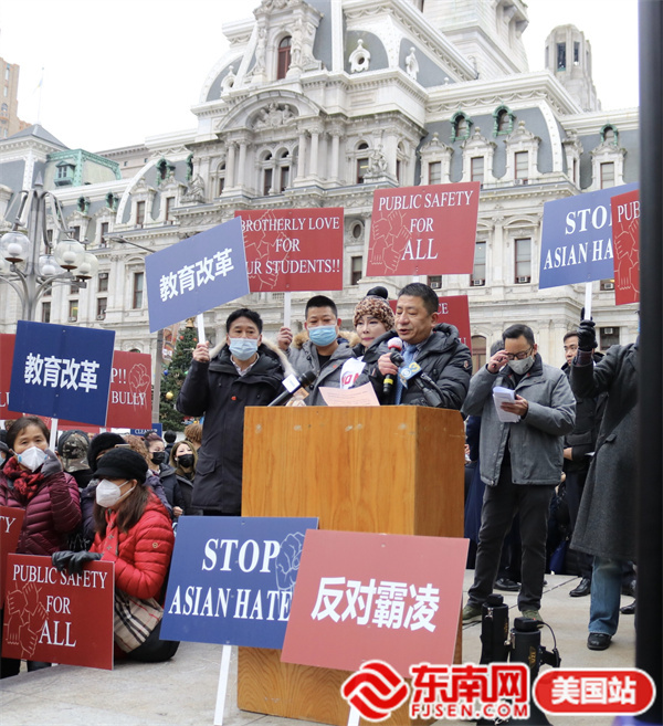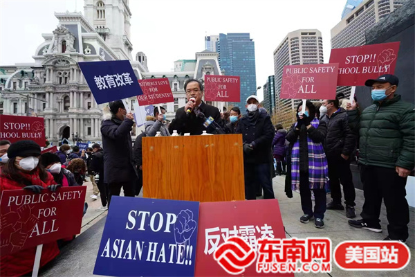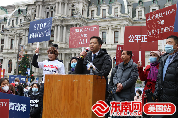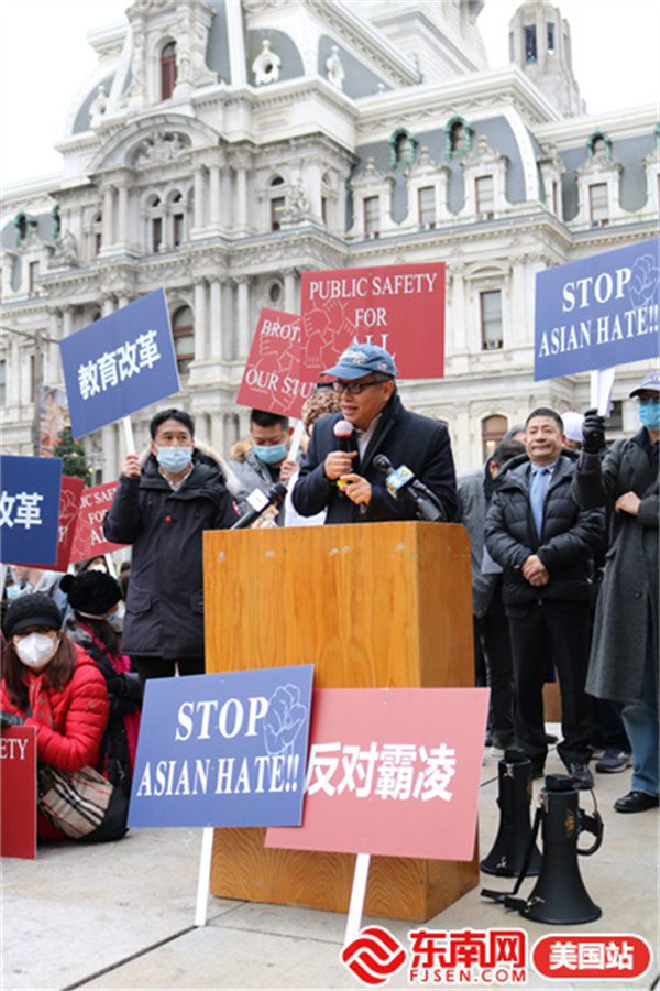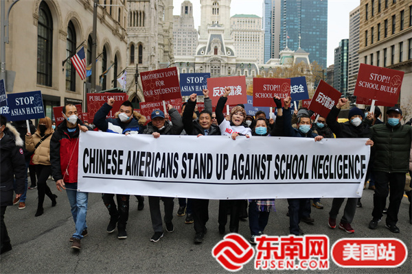 东南网美国12月2日讯(本网特约记者 白水 文/图)当地时间11月30日,由美国宾州华人侨团联盟发起,亚裔维权大联盟、美国华人华侨联合总会等携手全美近百个社团组织的“伸张正义·杜绝霸凌”反对种族歧视大游行在费城市政厅举行。此次活动得到纽约、华盛顿、波士顿、佛州、加州等地华人社团的声援支持,数千人参加。