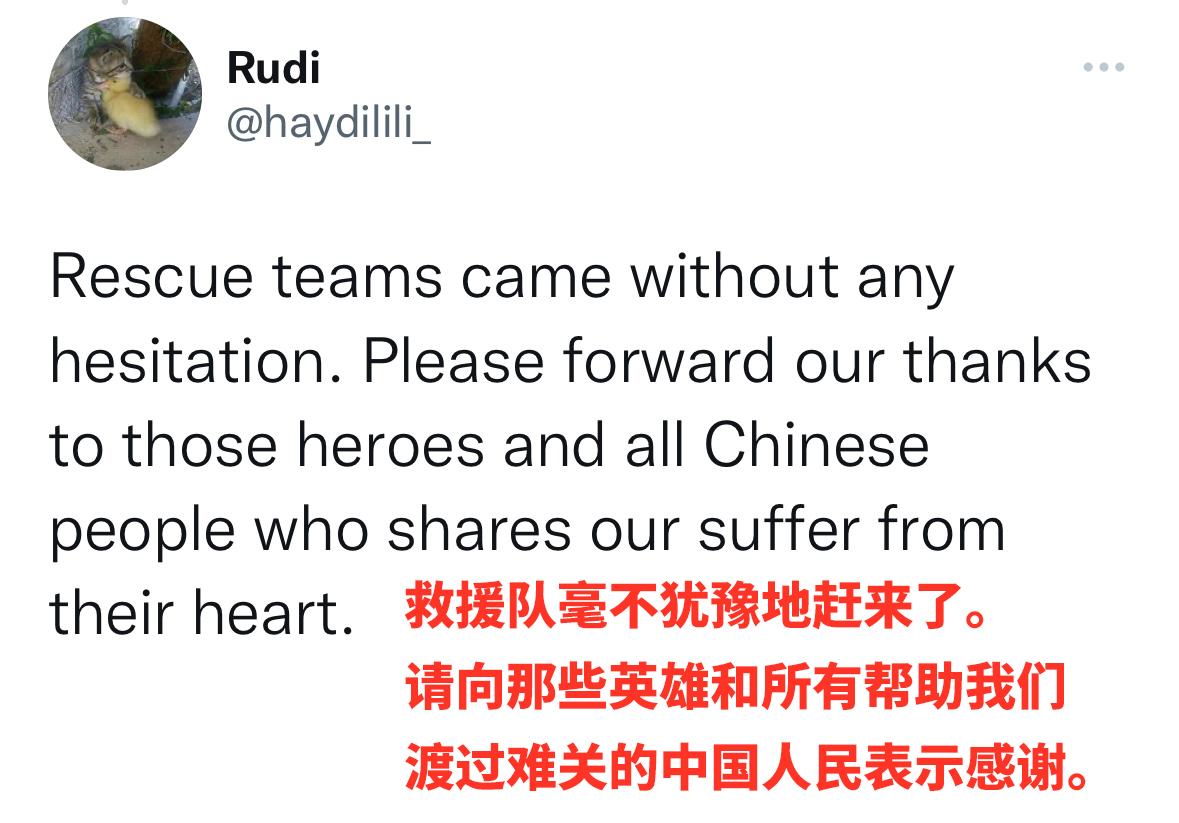 2023-02-16 21:36:48 来源: 中国日报网 责任编辑:黄丽红 作者:2月6日,土耳其发生两次7.8级地震,中国政府和社会力量随即对土耳其进行紧急援助,充分体现了中国人民的国际人道主义精神和大爱无疆的情怀,以及中国人民对土耳其人民的友好情谊。 土耳其人民纷纷在社交媒体上表达对中国的感谢。 ![]() ![]() ![]() ![]() 还有土耳其网友用中文和汉语拼音表达对中国救援队的感谢。 ![]() ![]() ![]() 土耳其人民也用自己的方式表达了对中国和中国救援队的爱。 ![]() ![]() |