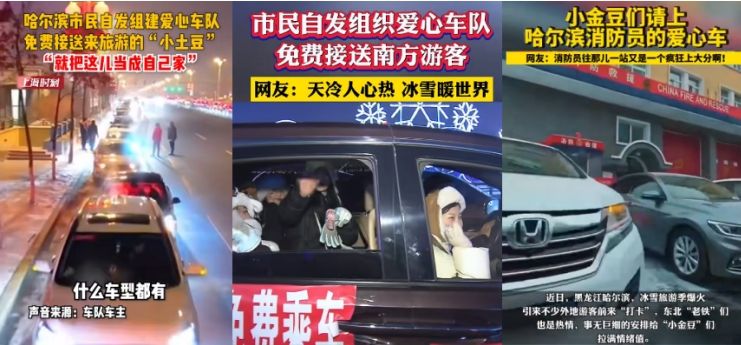 哈尔滨调整公交运营时间 动态调度140辆公交车 300台出租车运力 保障冰雪大世界旅客出行需求 “尔滨们”还自发组织爱心车队 免费接送游客 不仅义务介绍各种好玩好吃的 还免费提供暖宝宝