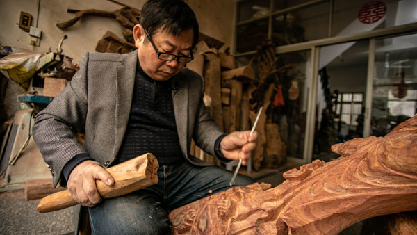 一块实木板上放着凿、雕刀、锯、钻等工具,匠人沉浸于雕刻中,选材、设计、打胚、修光……