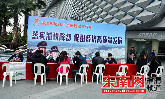 东南网4月2日福清站讯(记者 陈凤鸣)昨日上午,国家税务总局福清市税务局在福清万达广场开展主题为“落实减税降费 促进经济高质量发展”的第28个全国税收宣传月活动,为市民讲解税收相关知识,答疑解惑。