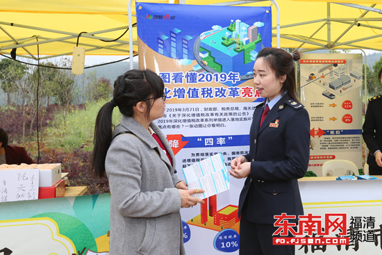 东南网4月15日福清站讯(记者 黎臻懋)4月的福清一都,风光秀美,枇杷飘香。13日,第二届福州(福清)枇杷节在福清市一都镇东关寨盛大举行。2万多人参加了此次枇杷节活动。正值税收宣传月,为进一步加强减税降费等政策的宣传,国家税务总局福清市税务局紧扣“落实减税降费,助力乡村振兴”的主题,由副局长林名国带队,在枇杷节现场开展税务宣传。