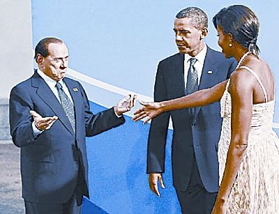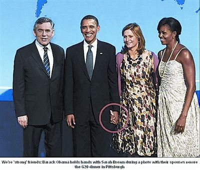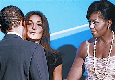 3张美国总统奥巴马夫妇在9月24日晚二十国集团(G20)领导人金融峰会晚宴上的雷人照片成为欧美媒体爆炒的焦点——一张照片显示,当奥巴马与法国第一夫人布吕尼拥吻时,他身旁的夫人米歇尔满脸不悦,仿佛打翻了醋坛子;另一张照片显示,当一贯以花心著称的意大利总理贝卢斯科尼张开双臂试图拥抱奥巴马夫人米歇尔时,一旁的奥巴马对他怒目相向,而米歇尔也只冷淡地与他握手了事;第3张雷人照片显示,当奥巴马夫妇与英国首相布朗夫妇合影时,奥巴马竟忘情地紧紧握住了布朗夫人萨拉的手!当这3张照片曝光后,立即在因特网上疯狂流传,俨然激起了一场轩然大波。
