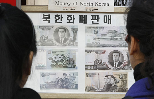 12月1日,韩国板门店一侧的韩国商店展示朝鲜新货币。据朝鲜官员当日对外透露,朝鲜于11月30日更换了货币,这是该国十七年来首次更换货币。新旧货币兑换率为100比1。