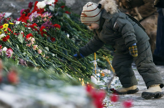 12月6日,在俄罗斯彼尔姆边疆区首府彼尔姆市,一名儿童向夜总会火灾事故现场献花,向遇难者表示哀悼。新华社记者鲁金博摄