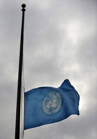 1月13日,美国纽约联合国总部大楼前的联合国会旗降半旗向海地地震中遇难者致哀。