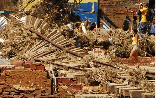 阿拉戈斯州受灾地区的一角,满地的碎片,让行人无从下脚,也无法想象到洪水侵袭前这个村庄是什么样子!(李杰)