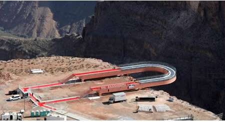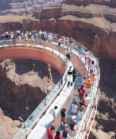 亚利桑那州大峡谷悬空桥外形犹如一个马蹄铁,距地面高度大约在4000英尺(约合1219米)左右,伸出大峡谷边缘达65英尺(约合20米)。站在悬空桥上,你能够真正感受到什么叫做“惊心动魄”。