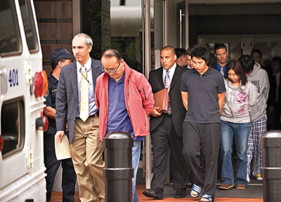 FBI探员押解信用卡诈骗集团成员前往法庭审理。