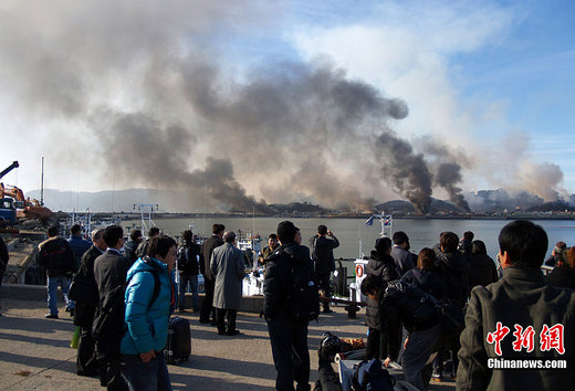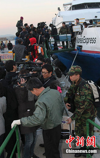 当地时间23日下午2时34分许,朝鲜向韩国一侧的延坪岛附近发射海岸炮炮弹,其中数枚落在有居民居住的岛上,导致数十栋建筑起火或受损。图为韩国延坪岛居民撤离到安全地区。