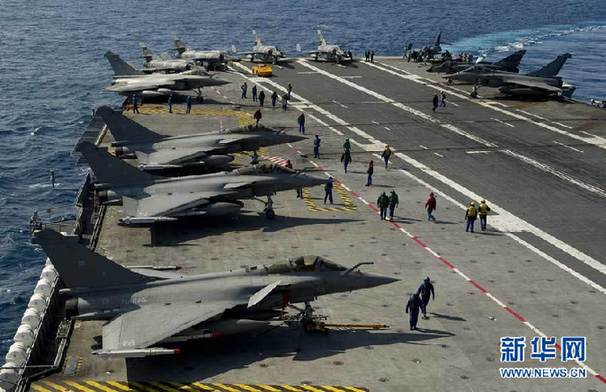 这张法国国防部3月24日提供的照片显示,“阵风”战机停在“戴高乐”号航母上,准备执行对利比亚的军事任务(3月23日摄)。法国国防部长热拉尔·隆盖23日在接受法国媒体采访时说,法国在利比亚实施军事行动头三天共炸毁利比亚军方装甲车十余辆。 新华社发