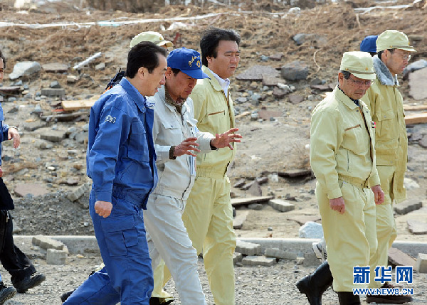 4月2日,日本首相菅直人(蓝衣)在岩手县陆前高田市灾区视察。当日,日本首相菅直人前往日本东北地区大地震、海啸重灾区岩手县陆前高田市、福岛县视察。 新华社记者 季春鹏 摄
