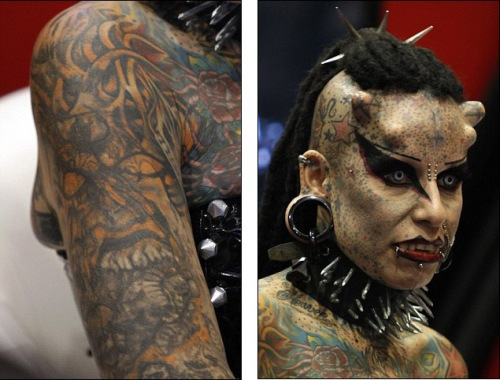 墨西哥惊现"吸血鬼女子" 全身纹身头长"角"(图)
