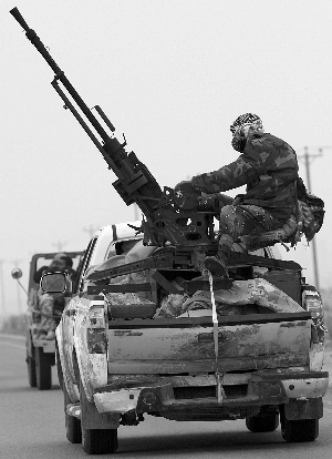 7日,利比亚反政府武装开车载着武器离开艾季达比耶。