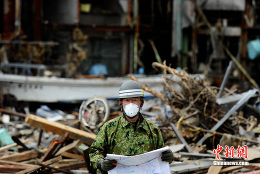 4月20日下午,一名日本自卫队队员在宫城县女川町的地震海啸废墟前查看地图。日本“3·11东北大地震”已发生一月有余,灾后重建工作正逐步展开。中新社发侯宇 摄