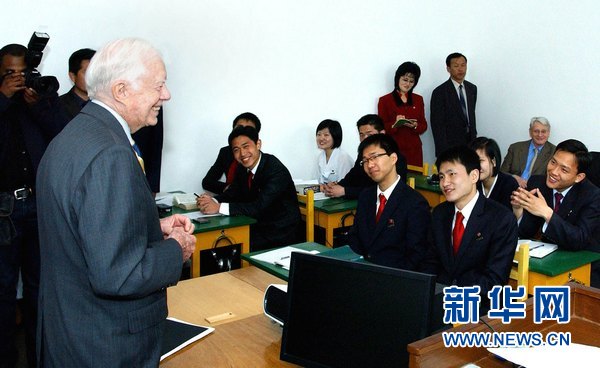 朝鲜中央通讯社4月27日提供的照片显示,美国前总统卡特(前左一)27日参观朝鲜外国语大学时与学生们进行交流。卡特一行是26日抵达平壤访问的,此行目的在于同朝方讨论缓和半岛局势和对朝鲜提供人道主义援助的问题。新华社/朝中社