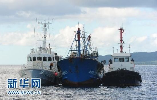 资料图:日本海上保安厅将中国渔船拖到冲绳县石垣港附近海域进行模拟海上作业检查。图为日本海上保安厅的两艘巡逻船将中国渔船夹在中间。