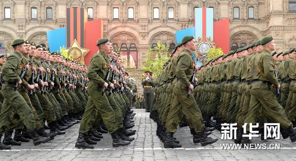 5月9日,在俄罗斯首都莫斯科举行的纪念卫国战争胜利66周年阅兵仪式上,士兵方阵从红场走过。俄罗斯纪念卫国战争胜利66周年大阅兵当天在莫斯科红场举行。1945年5月8日午夜时分,纳粹德国无条件投降的签字仪式在柏林举行。投降书从9日零时开始生效。由于时差原因,苏联当时已是9日凌晨。因此,苏联将5月9日定为战胜德国法西斯纪念日,即卫国战争胜利日。新华社发(王思维摄)