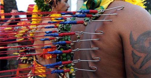 不寒而栗!印度教铁钩穿肉的大宝森节:大宝森节(Thaipusam)是印度教的重要节日,在淡米尔日历的每年十月份月圆之日举行(公历在1至2月间)。为感谢神灵医好病痛或为其实现愿望,信徒头顶奶壶或身负赎罪架(Kavadis)赤脚步行。赎罪架通常由金属钩、尖叉组成,用来剌入皮肤、脸颊及舌头,祈求洗尽罪孽并向神灵致敬。
