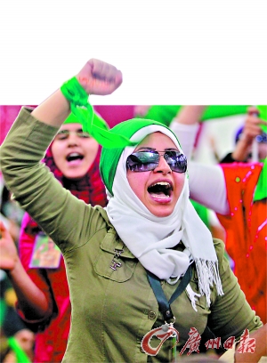 26日,支持卡扎菲政府的利比亚女性志愿者高呼口号,声称誓死捍卫卡扎菲。