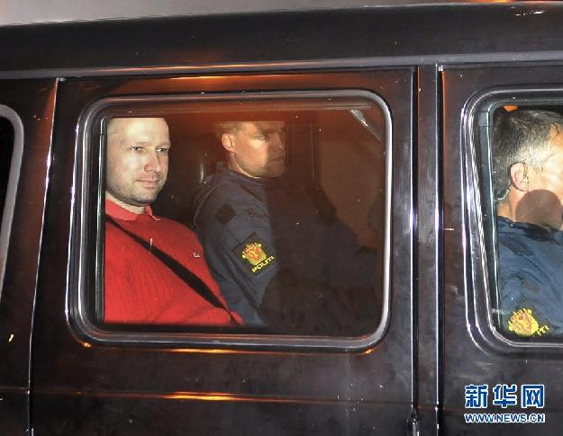 7月25日,被控制造7月22日挪威奥斯陆大爆炸和于特岛枪击事件的嫌疑人布雷维克(左一)乘坐警方车辆离开奥斯陆地方法院。挪威爆炸和枪击案嫌疑人安德斯・贝林・布雷维克25日首度出庭聆讯。法院驳回布雷维克公开听证的请求,决定采取闭门听证,不向公众和媒体开放。新华社/美联