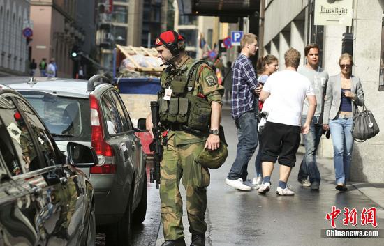 7月23日下午,一名全副武装的军人在挪威首都奥斯陆市中心巡逻,随时检查路边停放的车辆。7月22日下午,挪威首都奥斯陆市中心及郊外一座小岛先后发生爆炸和枪击事件。根据最新消息,两起暴力事件已造成至少92人死亡。中新社发沈晨 摄