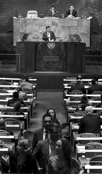 伊朗总统马哈茂德艾哈迈迪—内贾德22日在第66届联合国大会一般性辩论中发言,矛头指向美国、以色列和一些欧洲国家,引发多个国家代表退场抗议。