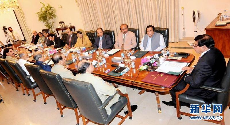 这张7月3日巴基斯坦新闻和广播部提供的照片显示,巴基斯坦总理拉贾·佩尔韦兹·阿什拉夫(右一)主持召开巴基斯坦内阁国防委员会会议。巴基斯坦新闻和广播部长卡马尔·扎曼·凯拉当晚说,在美国国务卿希拉里·克林顿就北约去年11月空袭巴检查站一事道歉后,巴基斯坦决定重开北约补给线。新华社发 |