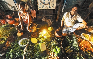 7月31日,在印度加尔各答,两名商贩等候顾客选购蔬菜。 新华社