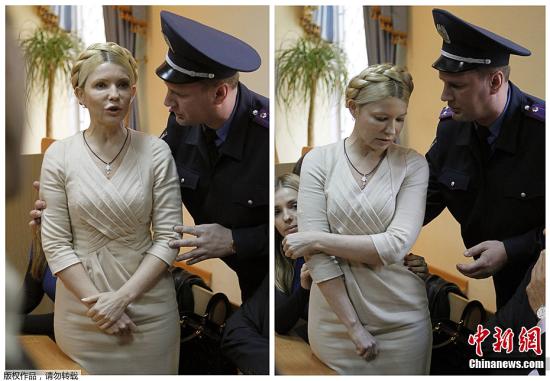 资料图:2011年10月11日,乌克兰前总理季莫申科在听取法庭判决时讲话,一名法警要求她保持安静。乌克兰一家法院当地时间11日宣布,前总理季莫申科因在乌俄两国天然气供应协议中滥用职权被判处7年监禁。