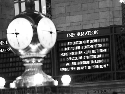 10月28日,美国纽约中央火车站的告示牌显示即将停运的通知