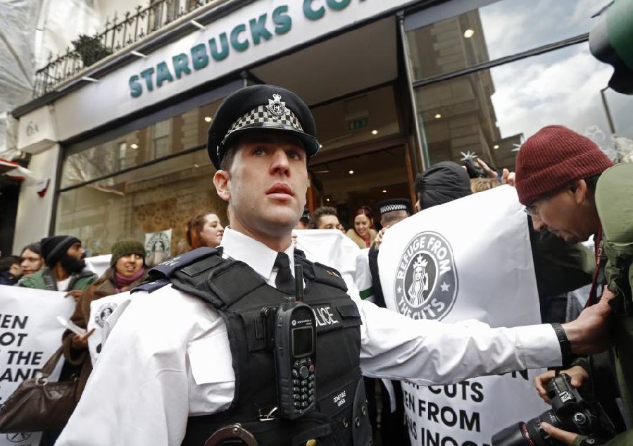 8日,英国反逃税团体UK Uncut的成员在全国发起抗议,声讨星巴克过去3年中以各种手段少交企业税。 |