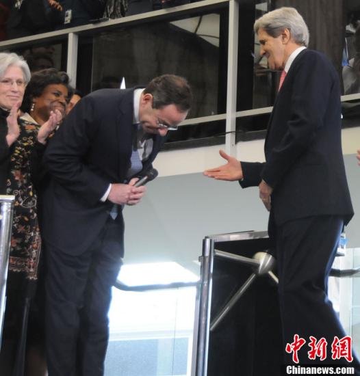 华盛顿时间2月4日,美国新任国务卿克里来到国务院报到,正式开启自己的国务卿任期。在欢迎仪式上,国务院“二把手”、常务副国务卿奈兹鞠躬祝贺克里到任。中新社发德永健 摄
