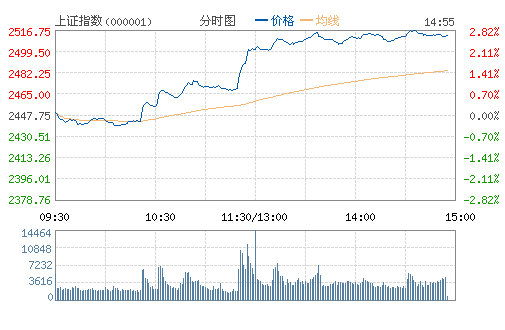 午后大盘持续震荡放量大涨,截至14:33,上证指数涨2.79%,报2516.01点;深证成指涨3.29%,报11030.63点,放量站上11000点关口。目前两市成交额超过上日约5成。