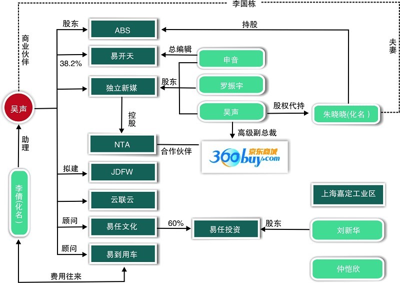 这些错综复杂的生意链显示,吴声除了在京东商城任高级副总裁一职,还和其他多家公司有着密切的关系,要么是他亲自或找代理人持股一些公司,要么是他担任一些公司的顾问。
