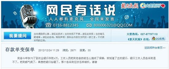 年近70岁的周大爷是投诉者之一。他介绍,去年6月在荆州区一家银行办理了5万元活期存款,上周老伴去取款时被告知3年期满后才能取,现在取需交纳违约金。他回忆,当时银行的工作人员说了可拿到高利息等好处,他就在好几张单子上签了字。周大爷的儿子说,老人手上拿的是保险单。