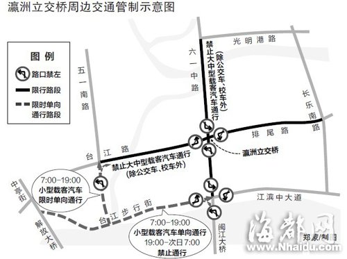 记者昨从福州市城建部门获悉,瀛洲立交桥拆除期间,立交桥路口全面禁左,台江步行街早7点至晚7点,小车由西往东单向通行,以分流车辆(具体管制见示意图)。