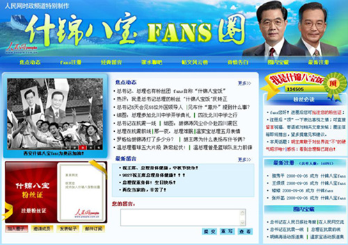 根据网友要求,9月4日,人民网时政频道正式推出“什锦八宝fans圈”网页,为胡锦涛主席、温家宝总理的“粉丝”们提供一个讨论、交流和表达平台。截止5日上午12时,在该网页注册的“粉丝”已达6000余人。每位注册“粉丝”都能够在网上得到一个“什锦八宝fans”证。