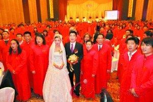 近日在广州琶洲香格里拉酒店的一场婚宴上,全场400多名婚宴嘉宾身着红色长袍,齐齐面向国旗高唱国歌,在1000平方米的大厅里形成“红海”一片,国歌声嘹亮,场面非常壮观。(《现代快报》2008年12月30日)