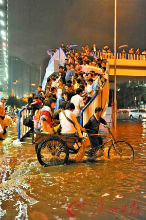 路浸了,车堵了,“摆渡”的平板三轮车火了。图片来源:广州日报
