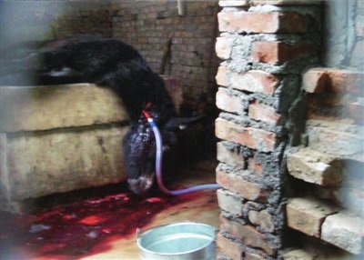 有知情者致电本报称,北京市通州区桂家坟村一无照、无检疫、无屠宰手续的屠宰黑窝点,每天屠宰活驴10余头。屠宰后的驴肉都被注入大量水,运往岳各庄批发市场牛羊肉大厅,以及北京的其他销售点内。4月22日至5月8日,本报记者对该屠宰窝点和该商户进行暗访,记录下了其屠宰和交易过程的内幕。(5月11日《京华时报》)