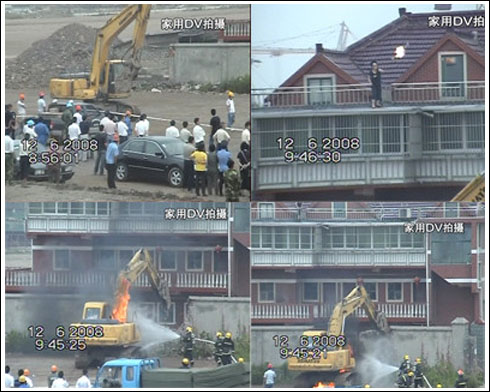 ①强拆队来到现场。②潘蓉向下投掷汽油瓶。③消防队扑灭汽油瓶引发的火焰。④推土机强拆潘蓉的住宅。
