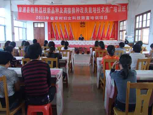 5月20日,省妇联2011年农村妇女科技致富培训项目——漳浦县农村妇女晚熟荔枝新品种及高接换种改良栽培技术推广培训班在赤岭乡政府会议室举办,来自赤岭畲乡各村的100名荔枝种植专业户、部分“双学双比”女能手、巾帼科技致富带头人参加了这次培训。县妇联副主席王秋月、赤岭乡党委组织委员林伟杰等县、乡领导亲临大会并讲话。培训班采取课堂授课与实地观摩相结合,此次培训邀请了漳浦县农业局经作站站长、高级农艺师庄文彬授课,他以通俗易懂的方言为广大荔枝种植户介绍了晚熟荔枝新品种、高接换种改良技术及栽培管理、病虫害防治等知识,并现场为广大女果农解答种植过程中遇到的疑难问题。课后学员们还参观了荔枝基地,庄老师现场讲解了嫁接技术,让大家有了更加直观的认识,受到了女果农们的欢迎。学员们一致认为,这次培训内容丰富,形式新颖,对她们帮助非常大,多数妇女对嫁接过程有了更深的了解,从而掌握了新方法、新技巧,希望有机会能多参加类似的培训,她们表示一定会把所学的知识运用到今后的生产中去,并带动更多的姐妹增收致富,增强发展好晚熟荔枝的信心。