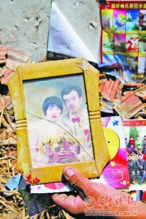 王淑霞家的房子塌掉后,家人从废墟中扒出夫妇俩的合影。王金强 摄