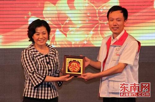 东南网总编黄志宏(右)接受省妇联党组成员、纪检组长王秋梅(左)送出的珍贵礼品。