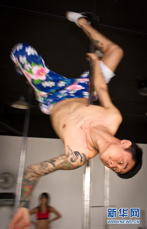 10月25日,闫少轩练习钢管舞。近日,由三名女选手依繁、宋瑶、曹诺和一名男选手闫少轩组成的中国钢管舞代表队在天津钢管舞训练中心紧张训练,备战将于11月10日在瑞士苏黎世举行的2012年国际钢管舞锦标赛。这四名选手都曾在两届中国钢管舞锦标赛中获得过前三名的成绩。赛事临近,四名选手紧张备战,除了日常教学工作外,每天上午和晚上进行近六个小时的训练,内容包括舞蹈编排和技巧练习,并专门进行肌肉力量的训练。国际钢管舞锦标赛发起于2003年,目前已经成为世界上最具影响力的钢管舞竞技大赛。由国际钢管舞锦标赛授权的中国钢管舞锦标赛已经在天津成功举行了两届,为国内竞技钢管舞选拔了不少人才。新华社记者岳月伟摄